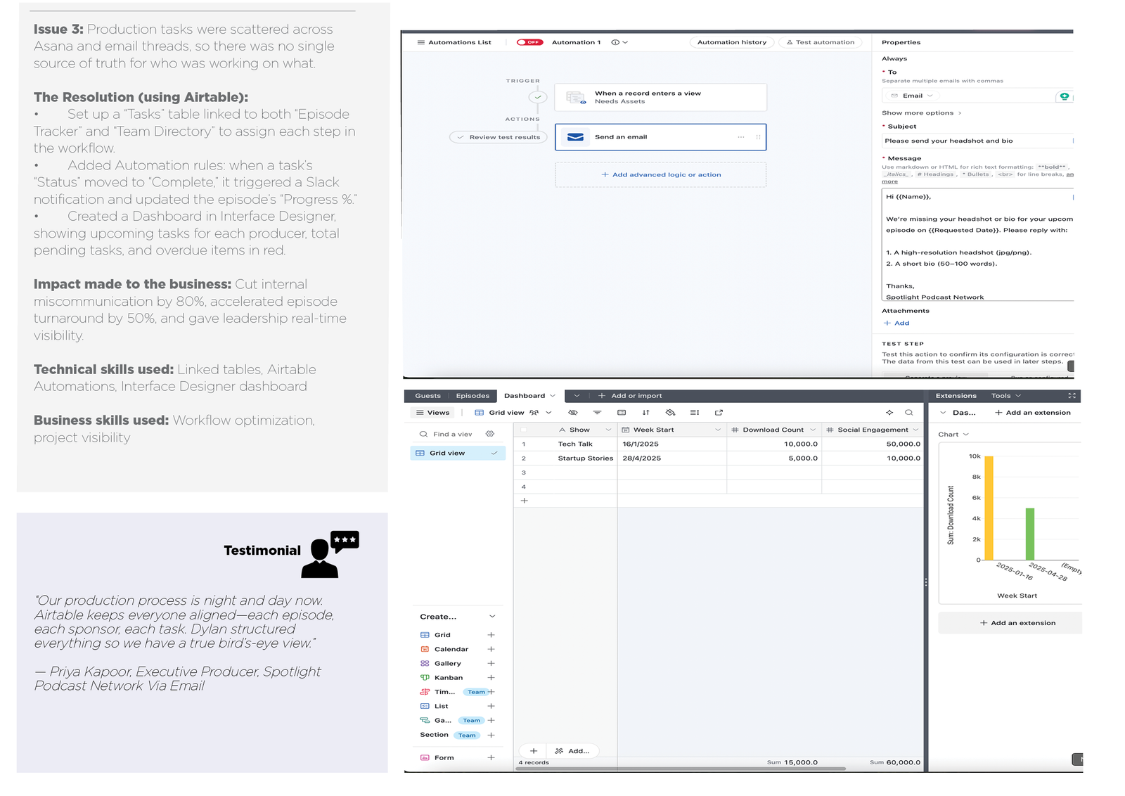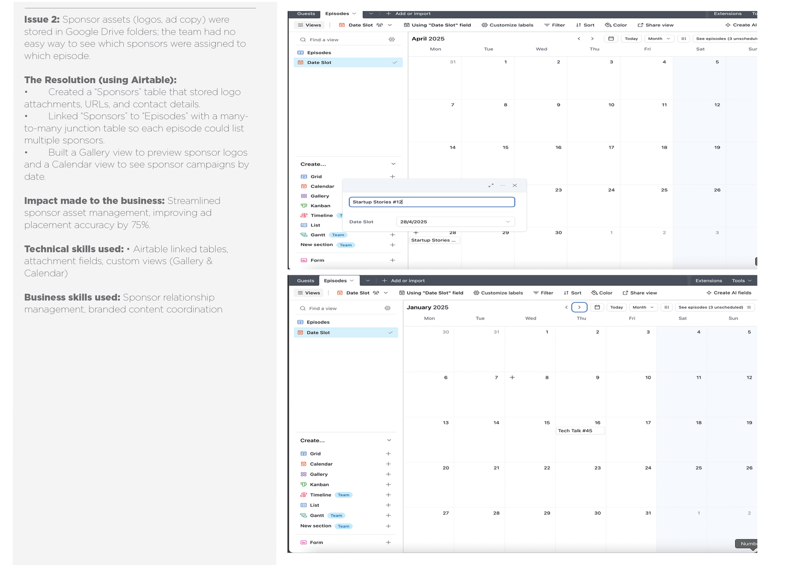 Our production process is night and day now. Airtable keeps everyone aligned—each episode, each sponsor, each task. Dylan structured everything so we have a true bird’s-eye view.